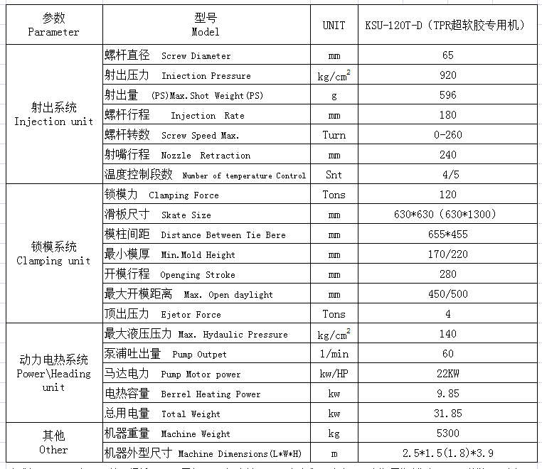TPR超软胶专用单滑板注塑机KSU-120T-S参数: